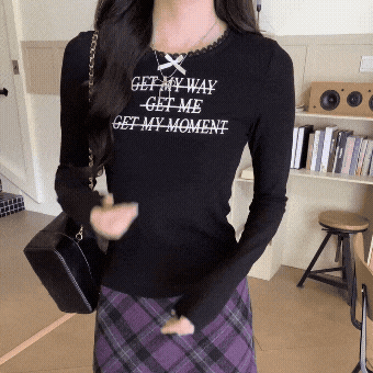 프린트와 레이스 가장자리 디테일이 포인트인 긴팔 티셔츠. 가을 시즌 이너로 활용하기 좋은 여성스러운 아이템입니다.