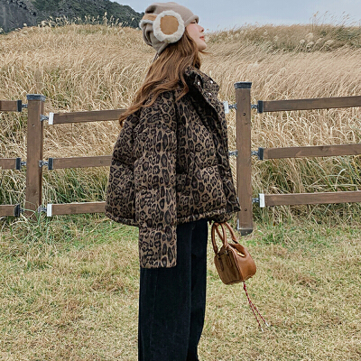 레트로 레오파드 무늬 쇼트 스타일 다운 여성 겨울 25 새로운 고급 센스 작은 대중 켄 콩 스탠드 칼라 패딩 재킷 면 의류 재킷